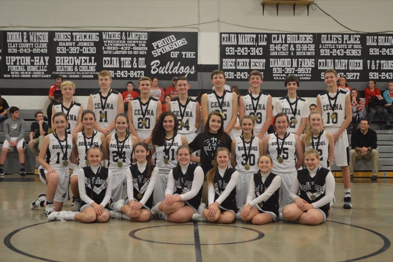 Celina Jr. High eighth-grade basketball players and cheerleaders were recently honored at their last home game and are currently taking part in the James C. Haile State Tournament in Murfreesboro. The Jr. Lady Dawgs were set to tip off second-round action Wednesday night at 5:45 p.m., followed by the Jr. Bulldogs at 7 p.m. Pictured are (first row, left to right) cheerleaders Haley Kirk, Tamara Smith, Kaylee Riddle, Zoe Seber, Anna Rae Collins, and Lily Corter; (second row, left to right) girls players Abby Eads, Eliza Jenkins, Cherokee Upton, Hunter Ledbetter, Kassidy Eads (Mgr.), Zoe Hayes, Claire Grace, and Lauren Weaver; and (back row, left to right) boys players Alec Kerr, Keaton Arms, Carson Sharp, Kolby Boles, Tyler Harris, Jeff Spivey, Aiden Kirk, and Grant Strong. (photo submitted)
