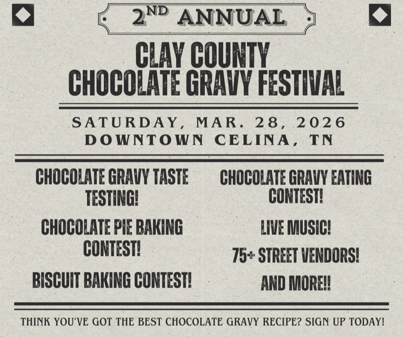 Besides chocolate gravy taste testing and contest, the festival will also include a chocolate pie baking contest, biscuit baking contest, chocolate gravy eating contest, live music, vendors, and more.