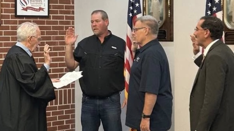 IT’S OFFICIAL-Newly elected City of Celina aldermen Tracy Mills and Michael Boles (center), along with re-elected mayor Luke Collins (right), were sworn into office by judge Jimmy White (left) last week. The trio, along with re-elected alderman Kenny Westmoreland (not pictured), will lead the municipality for the next four years. (Facebook.com/CityofCelinaTN photos)