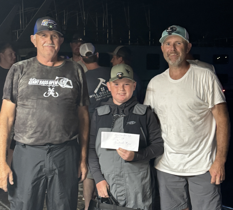 Jerry Arms and Doc Short won the big largemouth award with a 4.43-pound lunker, while father, son, and grandson team Steve, Stacy, and Drew Smith claimed the big smallmouth award with one under 16 inches long weighing 1.70 pounds.